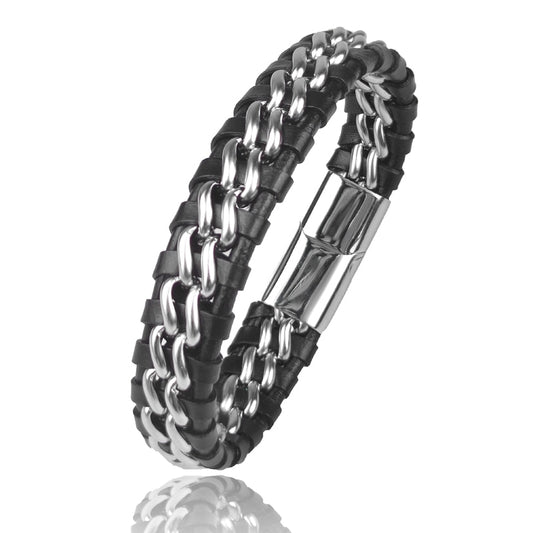 WM - 3 Layers Black Punk Style Design Leather Bracelet for Men Stainless steel